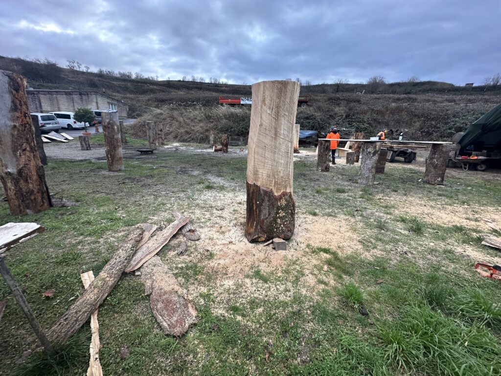 Ein entsprechender Teil des Holzstammes wird an seinen Geburtsort gebracht, wo die Transformation geschieht. Denn ich schnitze am Liebsten aus ganzen Holzstämmen.